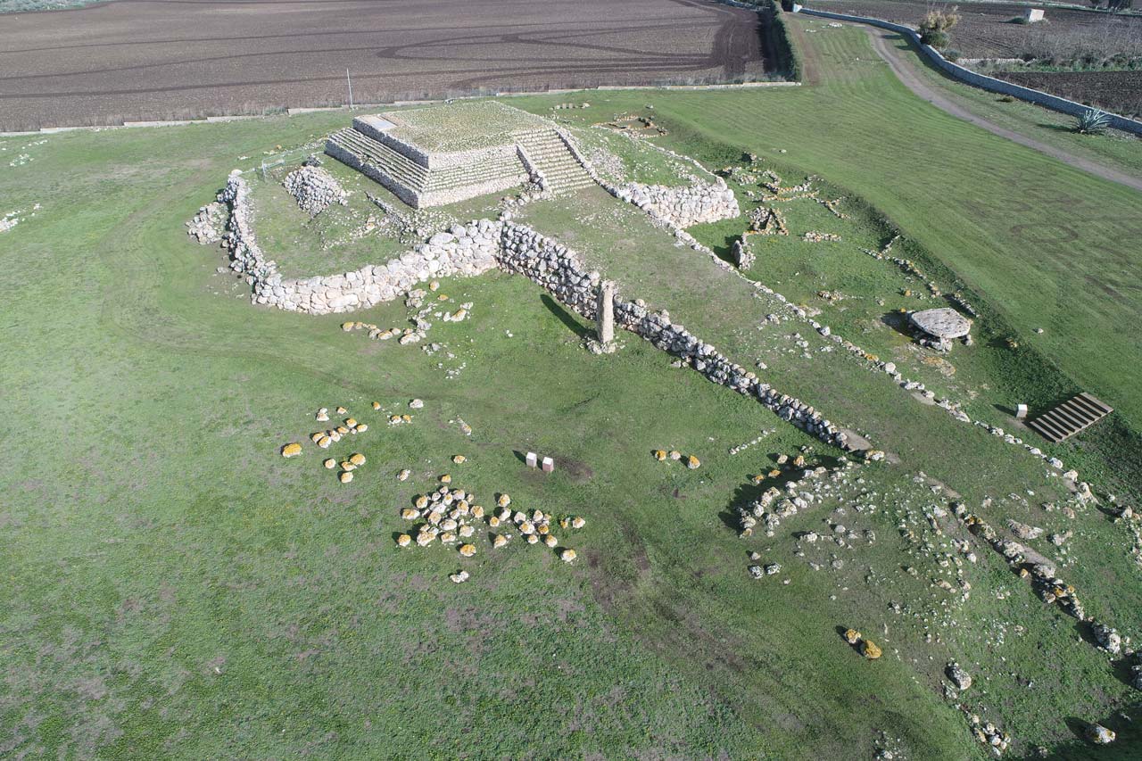 Intorno all’altare si estende un vero e proprio paesaggio sacro: lastre per le offerte, un grande menhir, blocchi sferoidali con coppelle e, nel territorio circostante, necropoli ipogeiche, dolmen e altri monumenti funerari.